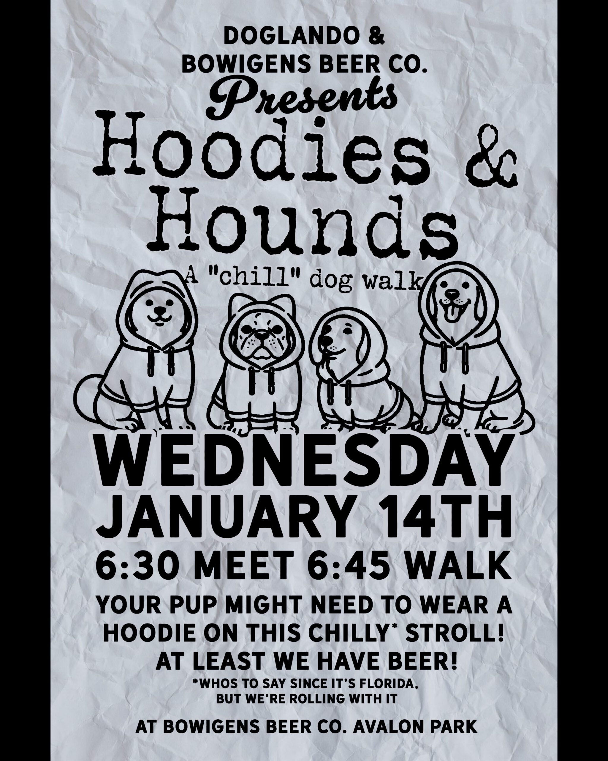 Doglando and Bowigens Avalon Park are teaming up for a cozy canine stroll! Join us Wednesday, Jan 14th for Hoodies & Hounds — a laid-back dog walk with good vibes and furry friends.