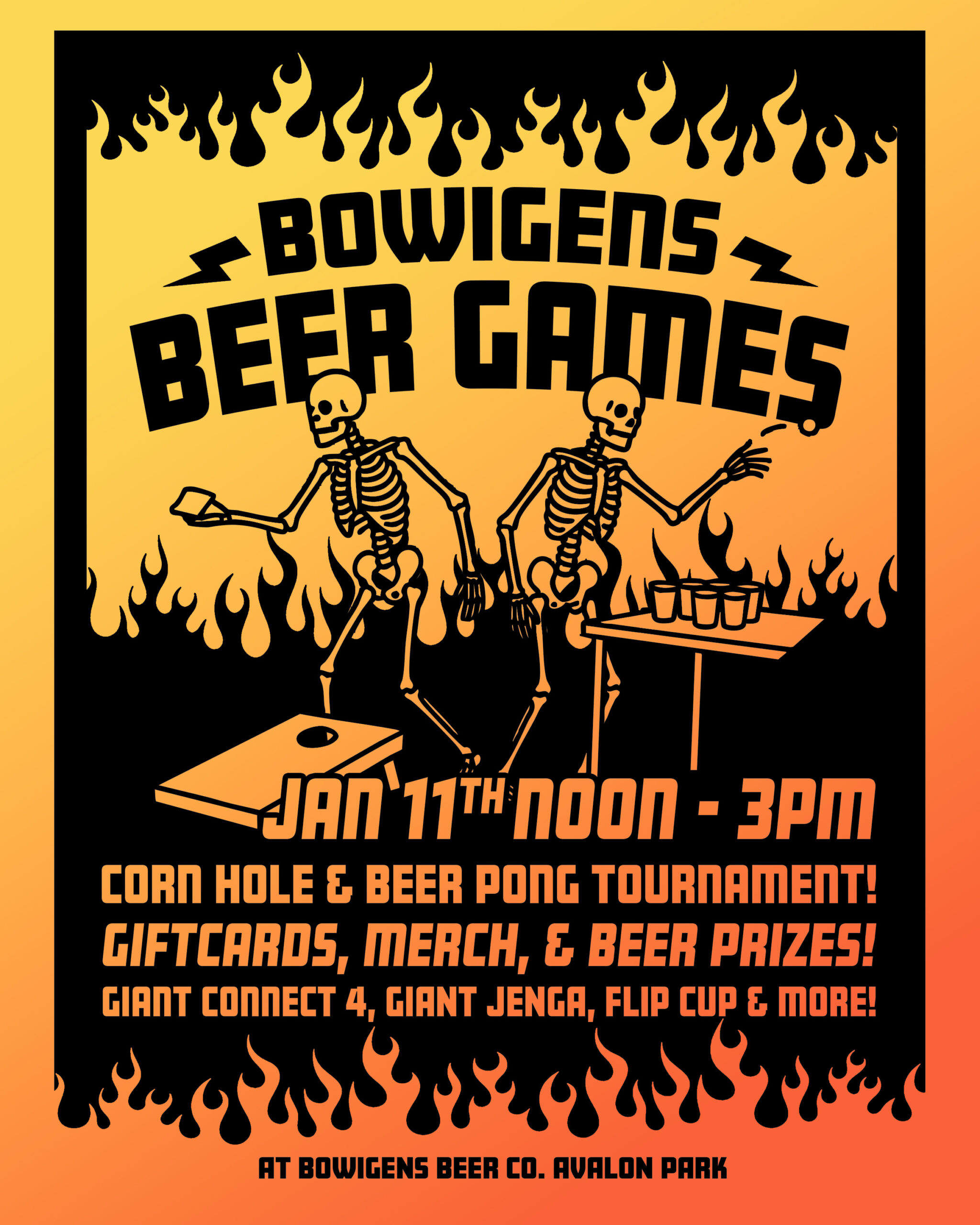 Join Bowigens Beer Company for Beer Games Sunday at the Marketplace on Sunday, Jan 11th from 12–3 PM! Compete (or cheer!) in cornhole and beer pong tournaments for gift cards, merch, and beer prizes, plus enjoy giant Connect 4, Jenga, and flip cup for nonstop fun.