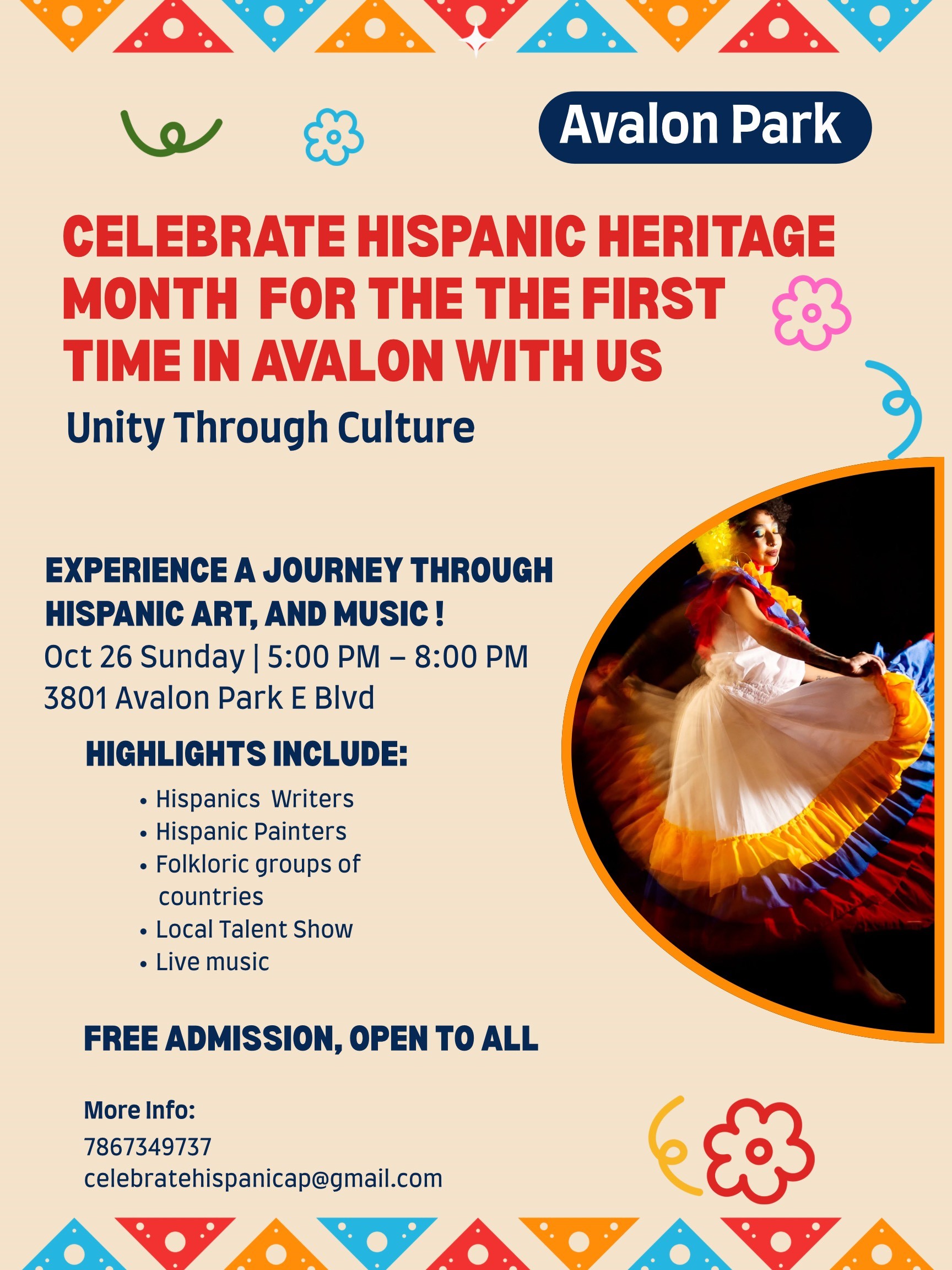 Join us Sunday, October 26th from 5β8 PM at 3801 Avalon Park E Blvd for a vibrant evening of art, music, and community as we honor Hispanic culture for the first time in Avalon Park! π